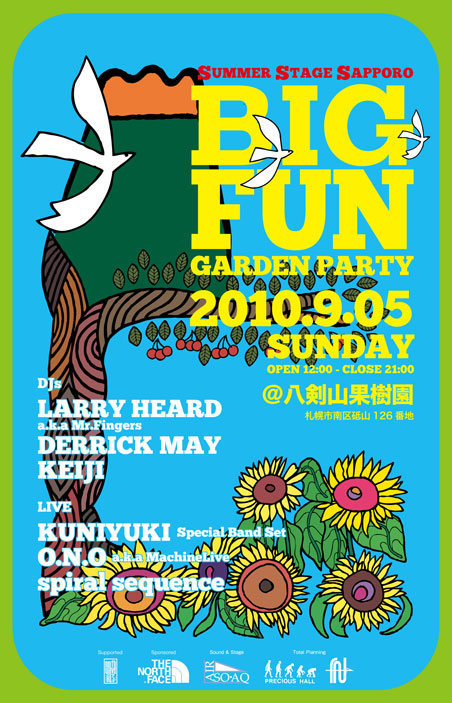 The artist line up was Detroit techno/house legend Derrick May, local jazz hero Kuniyuki, Ono from Sapporo’s own The Blue Herb, Spiral Sequence and Chicago’s own Larry Herd. All these artists combined made for a soulful summery mix enjoyed by all. As a bonus, just before the last hour of the festival the music stopped for a moment and partygoers turned their heads to enjoy an impressive fireworks show.
